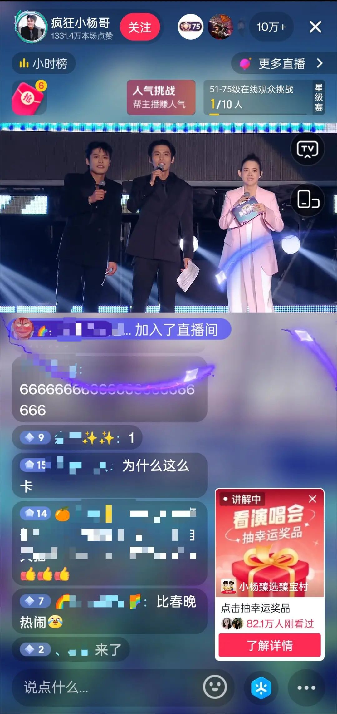 值得一提的是,演唱会全程,小杨哥的抖音直播间都未进行带货,甚至还关掉了打赏功能。只留下抽奖小程序,似乎真的完全是“给家人们发福利”。