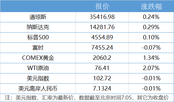 1、美国三大股指小幅收涨,道指涨0.24%,标普500指数涨0.1%,纳指涨0.29%。3M公司涨1.47%,波音涨1.4%,领涨道指。
