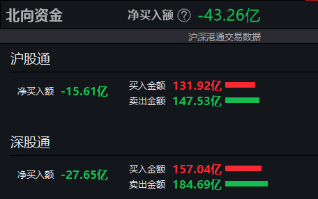 北向资金半日净卖出43.26亿元。其中沪股通净卖出15.61亿元,深股通净卖出27.65亿元。