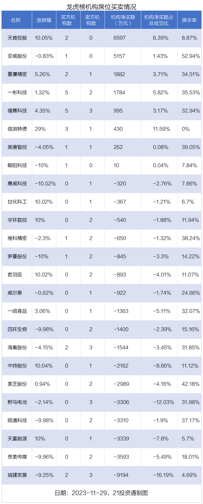 11月29日,25只个股龙虎榜出现了机构的身影,机构合计净卖出1.96亿元。具体来看,机构净买入8股,净卖出17股。
