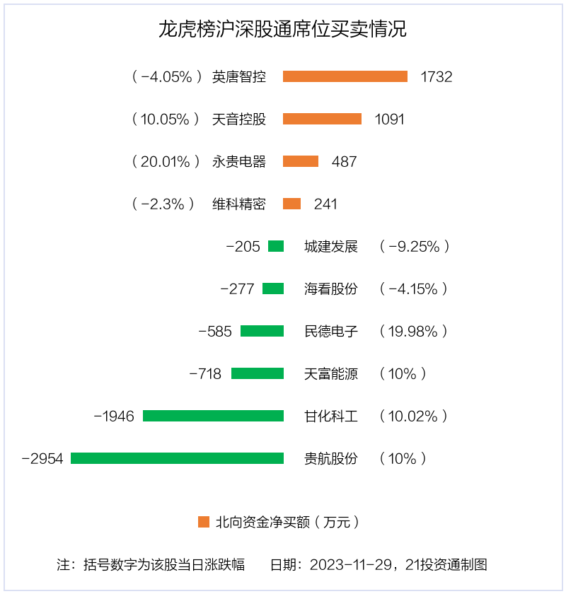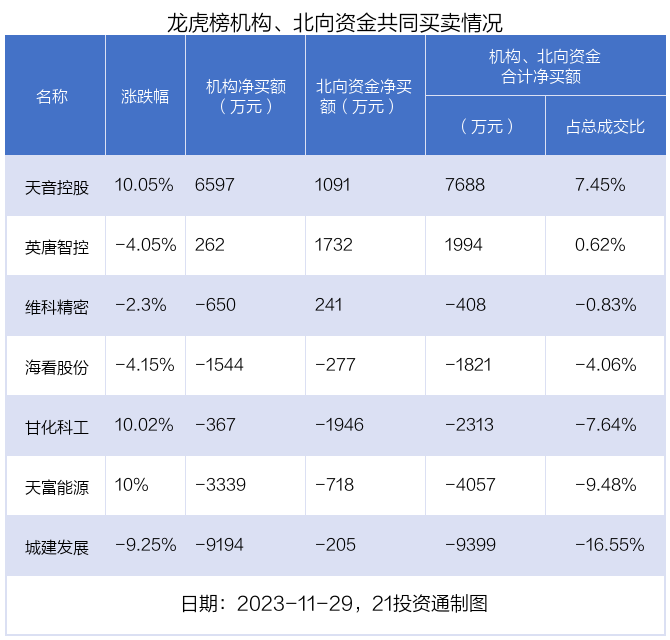 值得注意的是,机构和北向资金共同净买入了英唐智控、天音控股等2股;共同净卖出了城建发展、海看股份、天富能源、甘化科工等4股;在维科精密上出现分歧,机构净卖出维科精密649.81万元,北向资金净买入241.36万元。