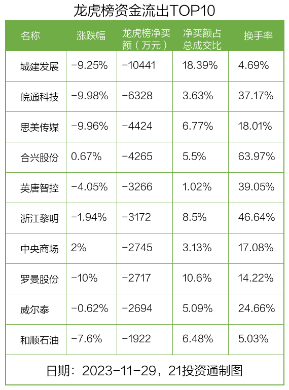 而龙虎榜中资金净流出最多的是城建发展(600266.SH),被净卖出为1.04亿元,占总成交金额的18.39%。城建发展收盘下跌9.25%,换手率为4.69%。