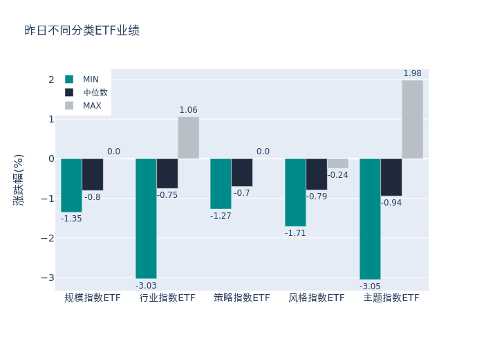 昨日股票型ETF收益率中位数为-0.83%。其中按照不同分类,规模指数中博时国证2000ETF收益率最高,为0.0%;行业指数中国泰中证煤炭ETF收益率最高,为1.06%;策略指数中天弘中证红利低波动100ETF收益率最高,为0.0%;风格指数中易方达上证科创板成长ETF收益率最高,为-0.24%;主题指数中黄金股ETF收益率最高,为1.98%。