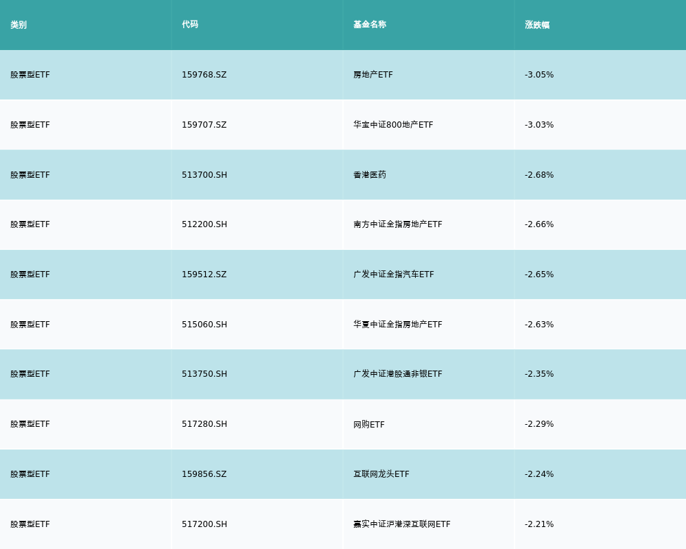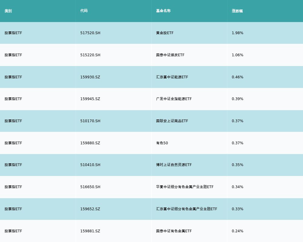 昨日股票型ETF涨幅最高的3支ETF及其收益率分别为:黄金股ETF(1.98%)、国泰中证煤炭ETF(1.06%)、汇添富中证能源ETF(0.46%)。涨幅前10详情见下表: