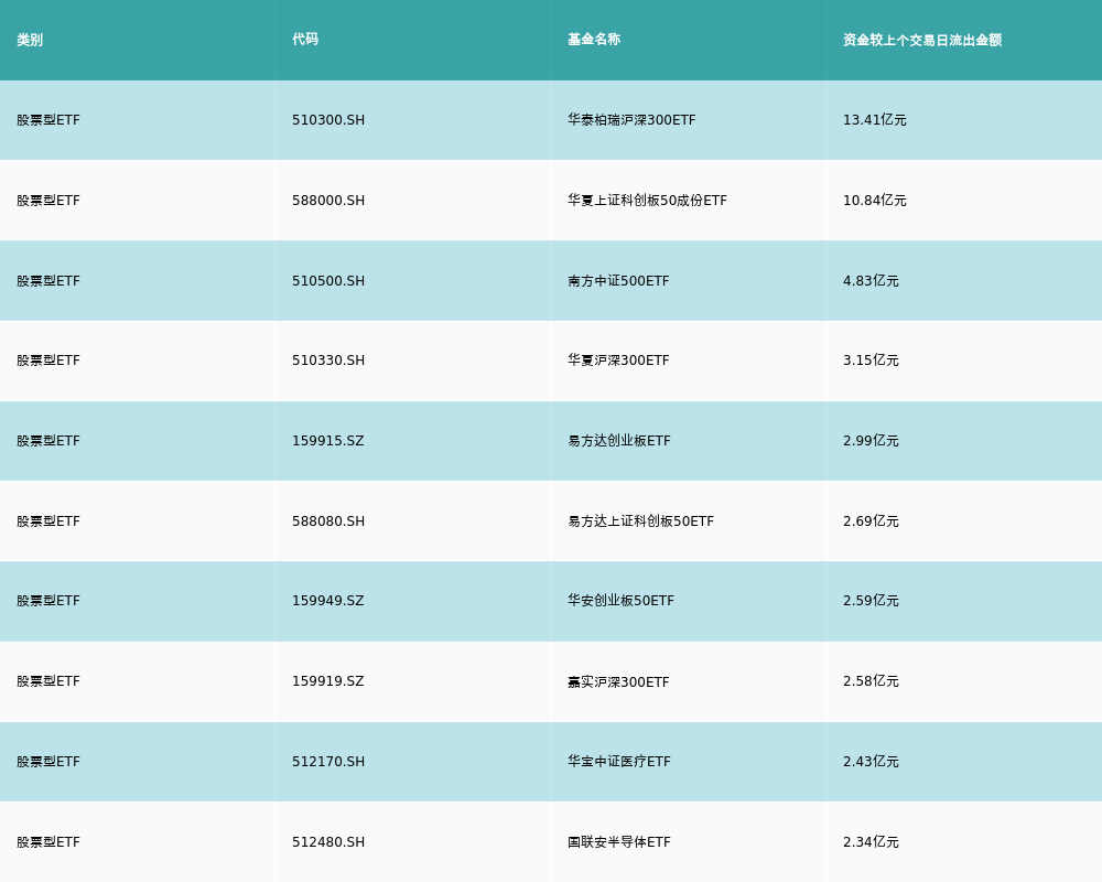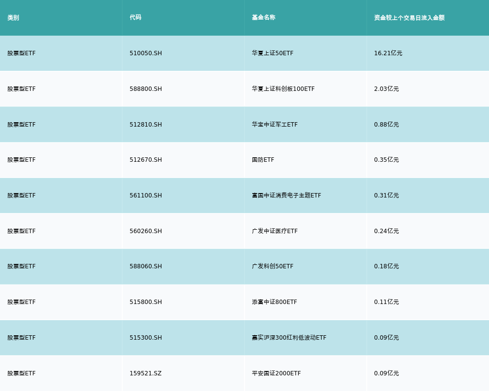 昨日股票型ETF资金流入最多的3支ETF及其流入金额分别为:华夏上证50ETF(流入16.21亿元)、华夏上证科创板100ETF(流入2.03亿元)、华宝中证军工ETF(流入0.88亿元)。资金流入前10详情见下表: