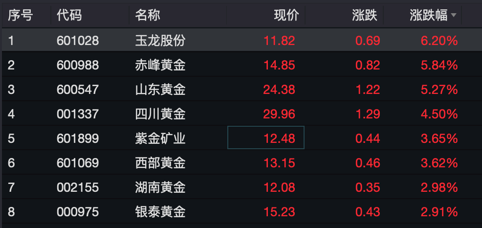 值得注意的是,主要黄金概念股4日盘中明显拉升走高,截至发稿,玉龙股份涨超6%,赤峰黄金、山东黄金涨约5%,四川黄金涨超4%,紫金矿业、西部黄金等涨逾3%。