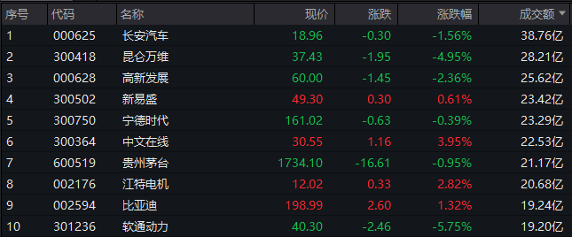沪深两市半日成交额4983亿,较上个交易日缩量551亿。个股方面,长安汽车半日成交额38.76亿元居首,昆仑万维、高新发展、新易盛、宁德时代、中文在线、贵州茅台、江特电机成交额均过20亿元,分别为28.21亿元、25.62亿元、23.42亿元、23.29亿元、22.53亿元、21.17亿元、20.68亿元。