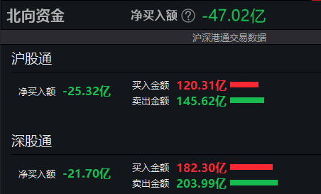 北向资金半日净卖出47.02亿元。其中沪股通净卖出25.32亿元,深股通净卖出21.70亿元。