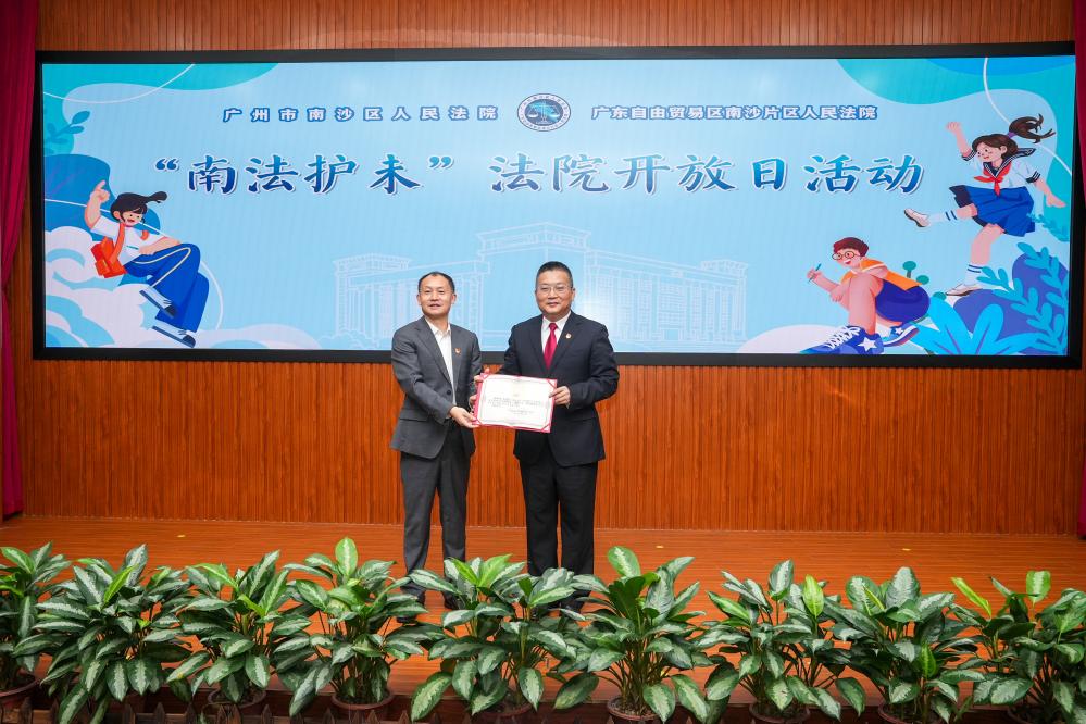 (广州二中南沙天元学校党总支书记、常务副校长许兴东向南沙法院党组书记、院长彭建华颁发“法治副校长”聘书)