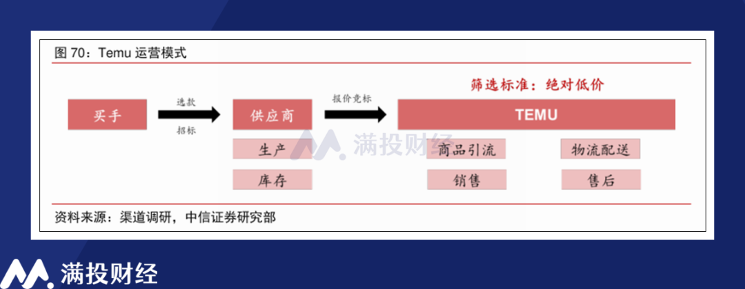 在经营模式上,TEMU采取的是类似自营的经营模式,尽管联系了大量的商家,但在运作时TEMU却享有对商品的定价、销售、履约、售后等一系列事项的管理权,而商家仅需要供货即可。某种意义上这类似TEMU对内采购,然后对外作为一个线上百货进行经营。其优势在于服务质量统一,价格变动灵活,而缺点则是较高的运营成本。
