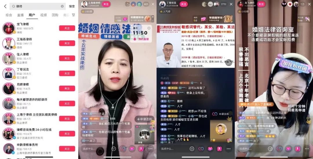 以龙飞律师为例,在她的直播间,苦情大戏、负心虐恋、家庭纷争,“比电视剧还精彩,还是真实存在的。”有网友说道。