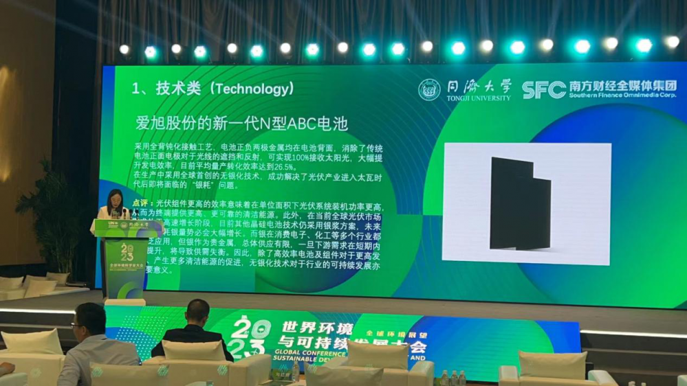 国内知名财经媒体《21世纪经济报道》新能源课题组(下称课题组)在上海市青浦区举办的2023世界环境与可持续发展大会上正式发布《21世纪·绿色低碳转型关键技术及解决方案》研究报告。爱旭股份(600732.SH)新一代N型ABC电池技术入选该报告典型案例。