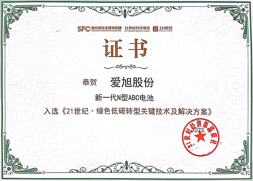 爱旭股份ABC电池技术入选《21世纪·绿色低碳转型关键技术及解决方案》
