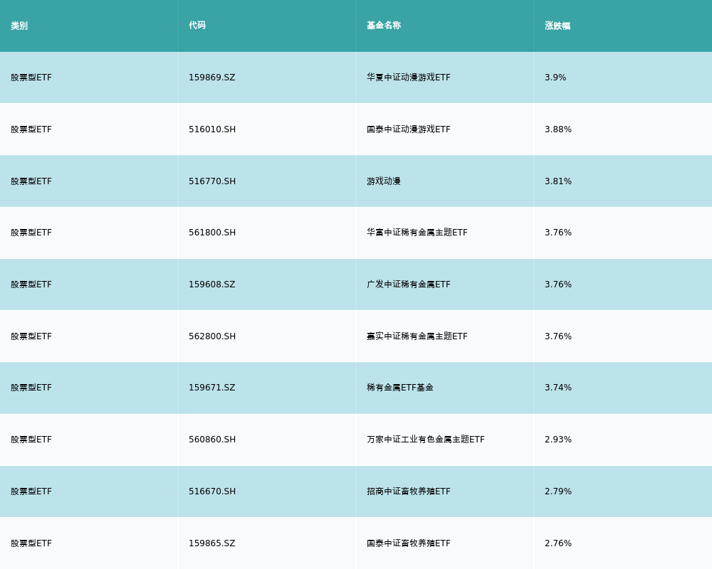 12月6日,股票型ETF涨幅最高的3支ETF及其收益率分别为:华夏中证动漫游戏ETF(3.9%)、国泰中证动漫游戏ETF(3.88%)、游戏动漫(3.81%)。涨幅前10详情见下表: