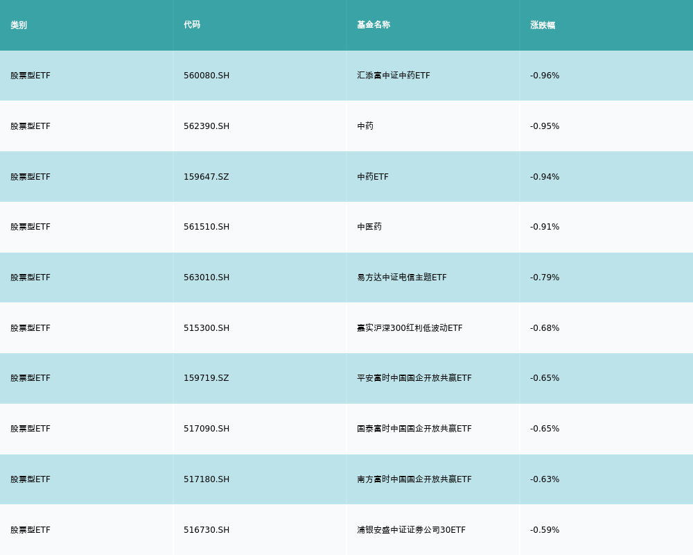 12月6日,股票型ETF跌幅最大的3支ETF及其收益率分别为:汇添富中证中药ETF(-0.96%)、中药(-0.95%)、中药ETF(-0.94%)。跌幅前10详情见下表: