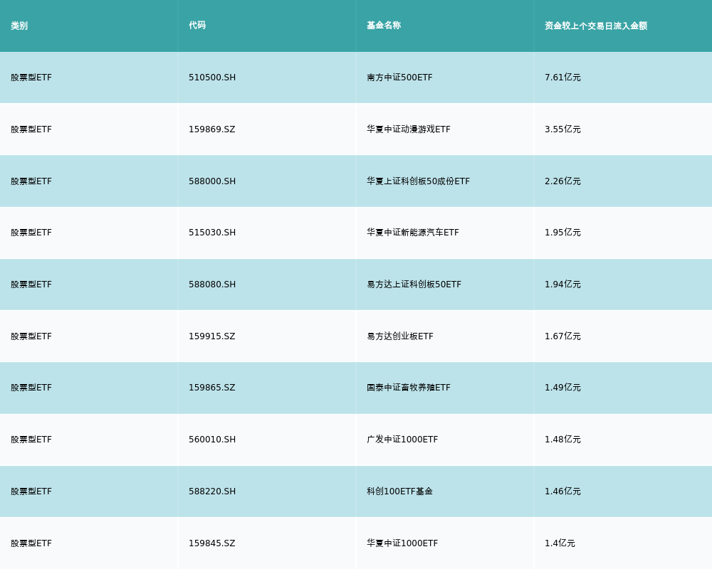 12月6日,股票型ETF资金流入最多的3支ETF及其流入金额分别为:南方中证500ETF(流入7.61亿元)、华夏中证动漫游戏ETF(流入3.55亿元)、华夏上证科创板50成份ETF(流入2.26亿元)。资金流入前10详情见下表: