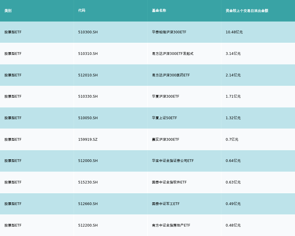 12月6日,股票型ETF资金流出最多的3支ETF及其流入金额分别为:华泰柏瑞沪深300ETF(流出10.48亿元)、易方达沪深300ETF发起式(流出3.14亿元)、易方达沪深300医药ETF(流出2.14亿元)。资金流出前10详情见下表:
