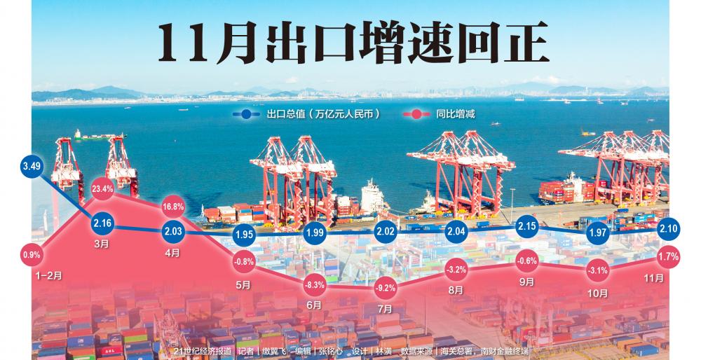 当月情况增势更为明显,11月份我国进出口3.7万亿元,增长1.2%。其中,出口2.1万亿元,增长1.7%,这也是自今年5月份以来的首次增速转正;进口1.6万亿元,增长0.6%;贸易顺差4908.2亿元,扩大5.5%。
