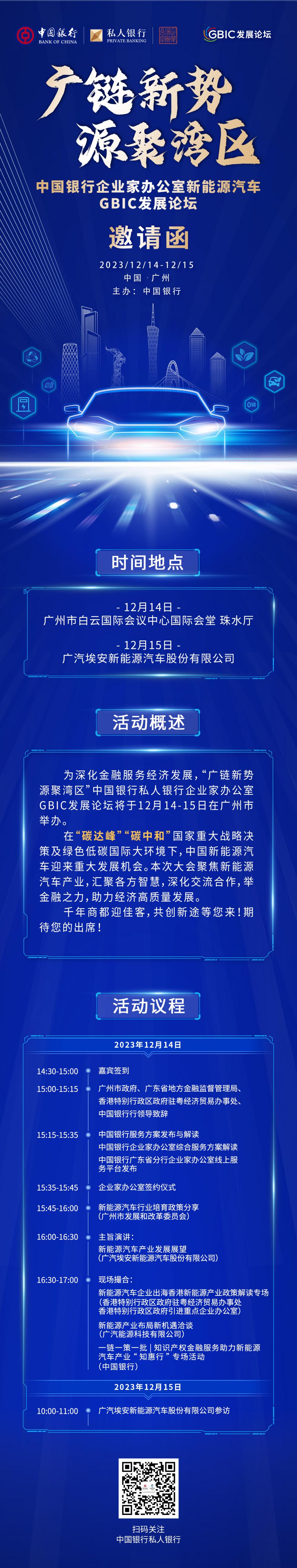 “广链新势 源聚湾区”。结合区域经济发展特色,聚焦新能源汽车产业,中国银行企业家办公室新能源汽车GBIC发展论坛在广州市顺利举办。论坛期间开展了政策分享、产业展望、企业参访、机遇洽谈及撮合等系列活动,意在进一步聚集资源,服务新能源汽车产业在粤港澳大湾区提速发展。