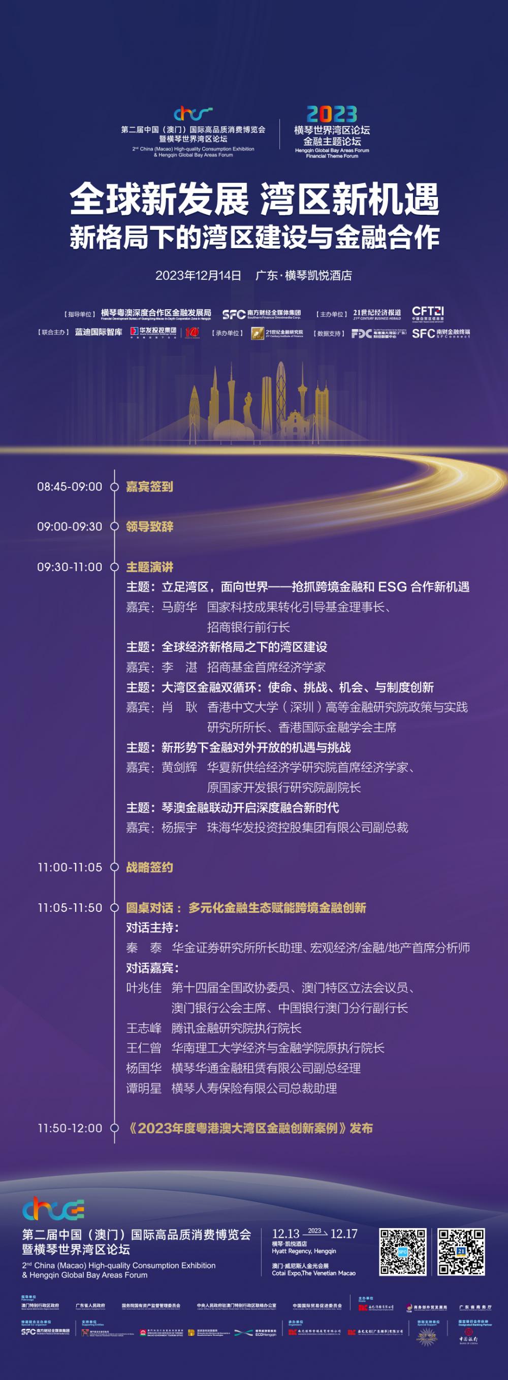 在此背景之下,12月14日,由横琴粤澳深度合作区金融发展局、南方财经全媒体集团指导,国内数字化智库型财经媒体领跑者《21世纪经济报道》、中国自贸区信息港主办,蓝迪国际智库、珠海华发投资控股集团有限公司联合主办、21世纪金融研究院承办的第二届中国(澳门)国际高品质消费博览会暨横琴世界湾区论坛金融主题论坛将在横琴举行。