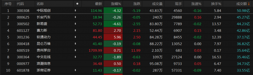 沪深两市今日成交额7875亿,较上个交易日缩量1240亿。个股方面,中际旭创成交额居首,为50.98亿元。其次是长安汽车、新易盛、赛力斯、软通动力,成交额分别为45.27亿元、44.23亿元、42.86亿元、37.17亿元。