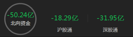 北向资金全天单边净卖出50.24亿元,其中沪股通净卖出18.29亿元,深股通净卖出31.95亿元。