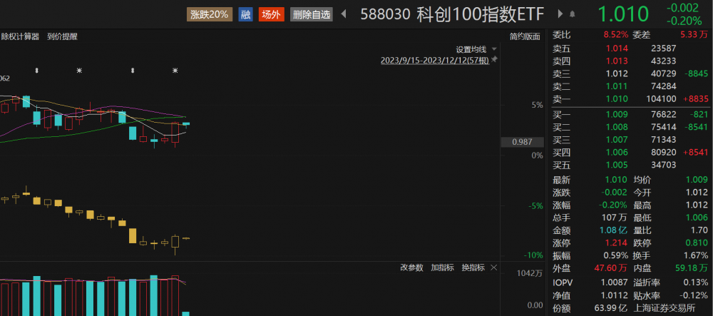 科创100指数ETF(588030)开盘后下挫,盘中震荡回升,现跌0.20%,盘中持续溢价,溢折率0.13%,成交额快速突破1亿元。截至12月11日,该ETF最新份额增长至63.99亿份,最新规模64.71亿元,再创历史新高。