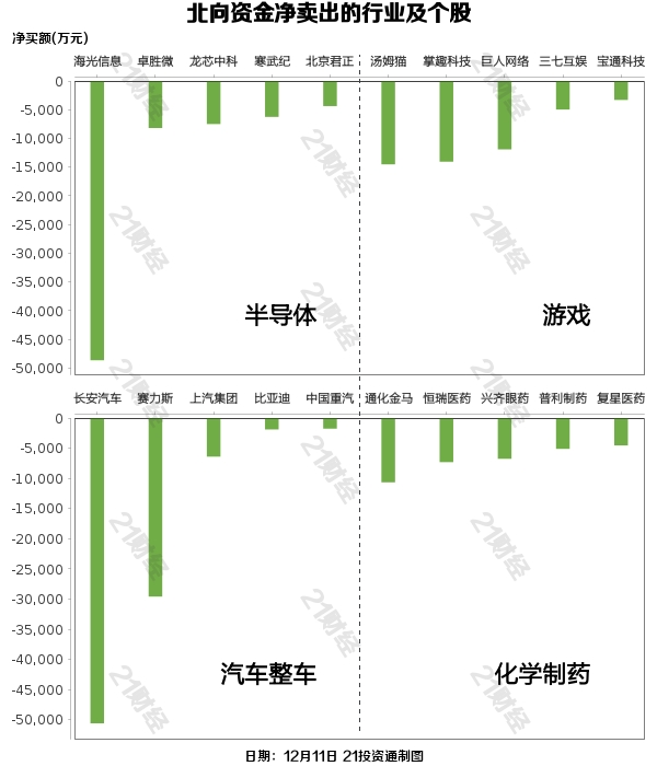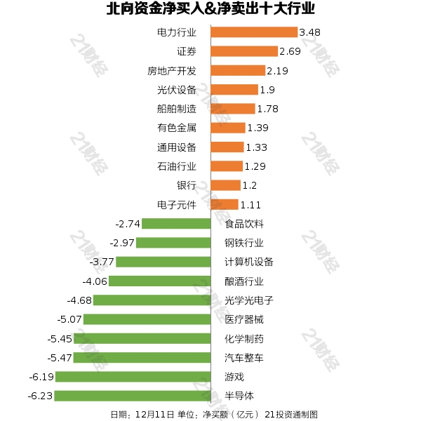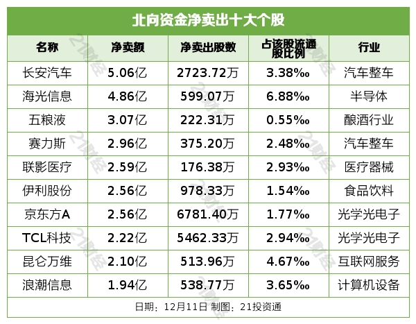 据21投资通智能监测,12月11日,北向资金净卖出32.59亿元,其中沪股通净卖出8.53亿元,深股通净卖出24.06亿元。