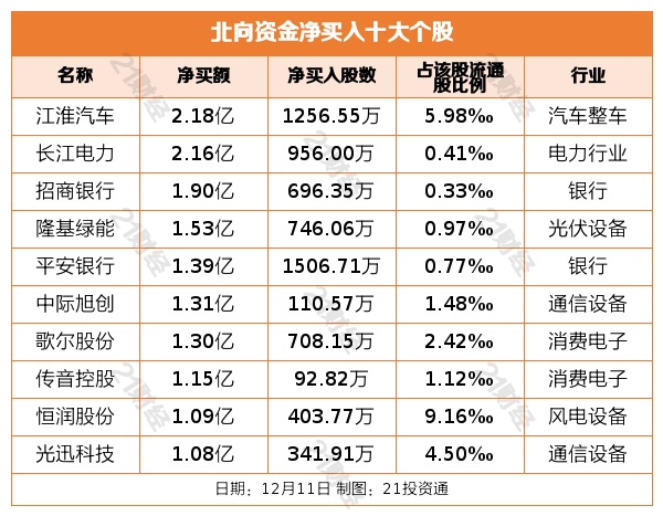 个股方面,北向资金净买入江淮汽车(600418.SH)、长江电力(600900.SH)、招商银行(600036.SH)、隆基绿能(601012.SH)、平安银行(000001.SZ)居前,其中,江淮汽车被净买入2.18亿元,长江电力被净买入2.16亿元,招商银行被净买入1.90亿元,隆基绿能被净买入1.53亿元,平安银行被净买入1.39亿元。