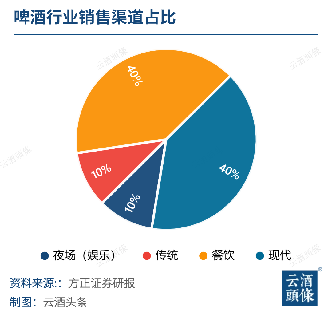方正证券研报分析,从啤酒行业销售渠道结构看,现饮和非现饮渠道各占一半。其中现饮渠道可进一步分为餐饮和夜场(娱乐),分别占比40%、10%;非现饮进一步分为现代渠道和传统渠道,分别占比40%、10%。