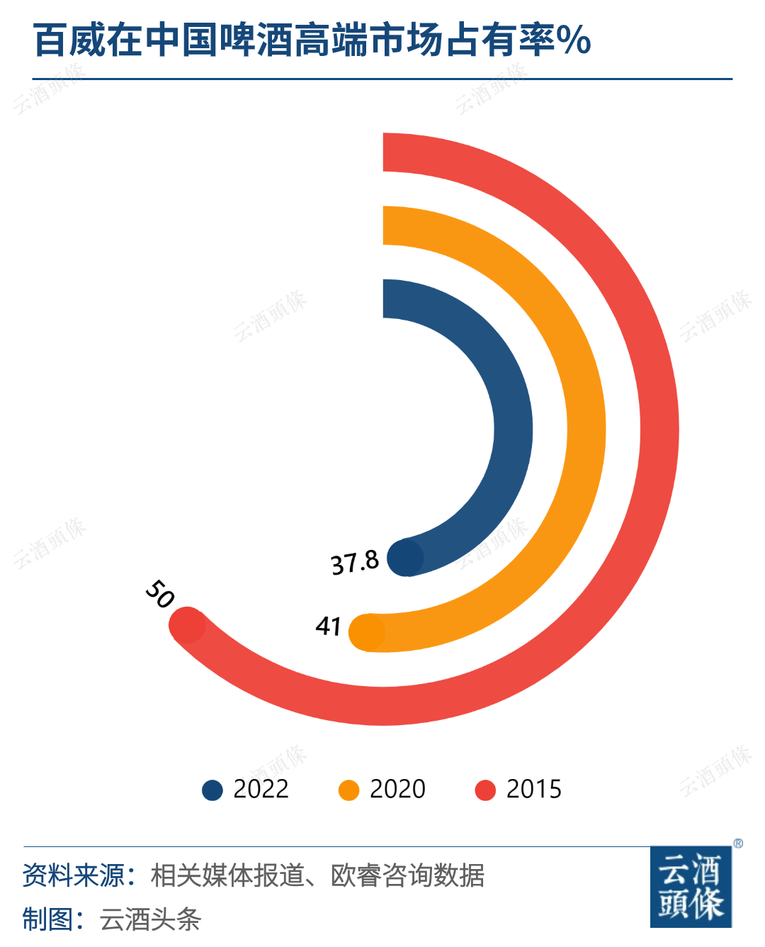 资料显示,百威在中国高端啤酒市场占有率从2015年的近50%下滑到2020年的约41%。另据欧睿咨询数据,2022年我国高端啤酒百威市占率(以销售额计)为37.8%,百威高端市场正被其他厂商抢夺。