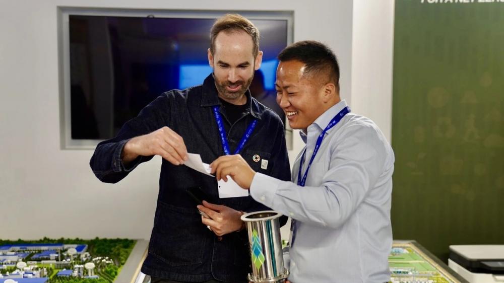 (联合国气候大会参会的外国嘉宾与壹颗赛艇项目负责人交流自己写下的时光胶囊)
