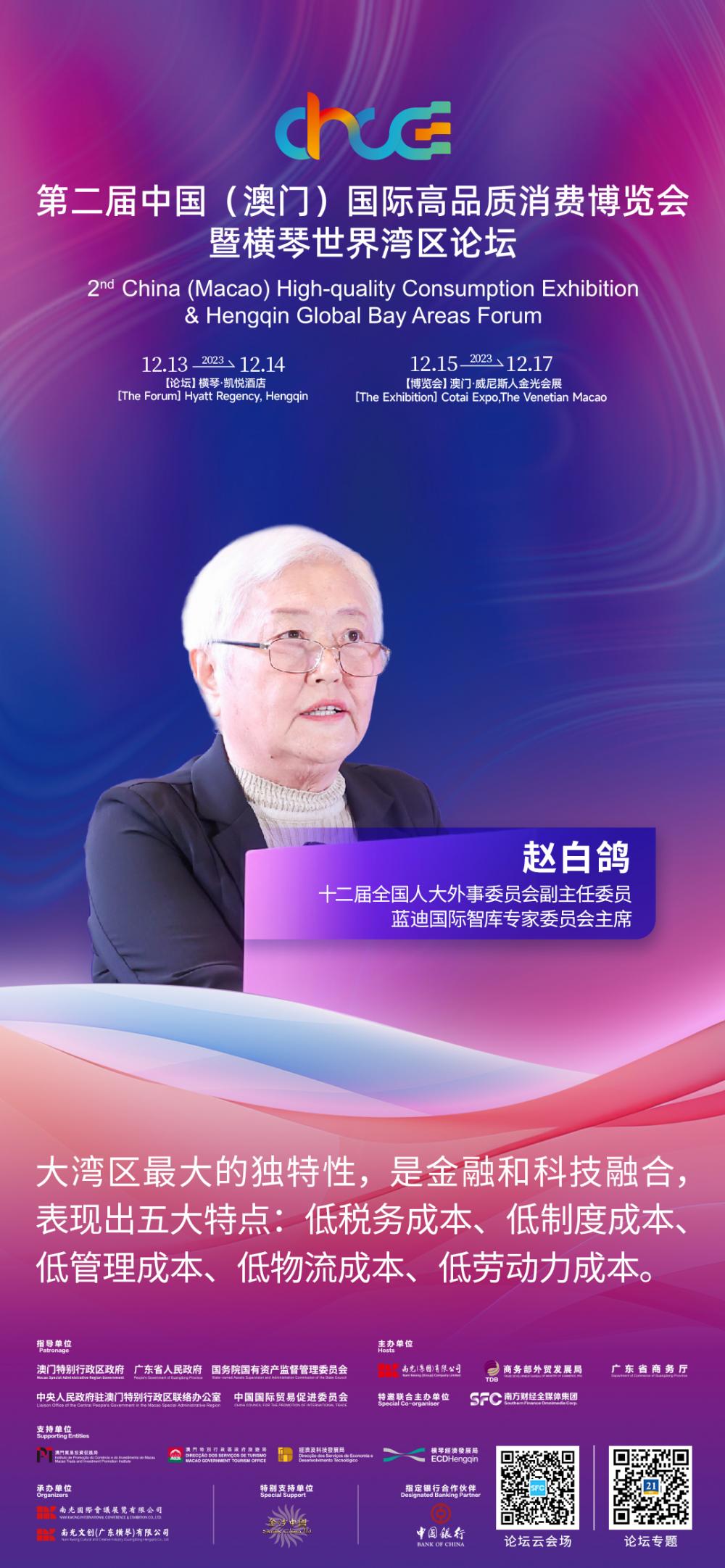 12月13日,第二届中国(澳门)国际高品质消费博览会暨横琴世界湾区论坛(简称“第二届高品会暨世界湾区论坛”)在横琴粤澳深度合作区举行。十二届全国人大外事委员会副主任委员、蓝迪国际智库专家委员会主席赵白鸽做题为“粤港澳大湾区:迈向世界级湾区的路径与价值”的主旨演讲。