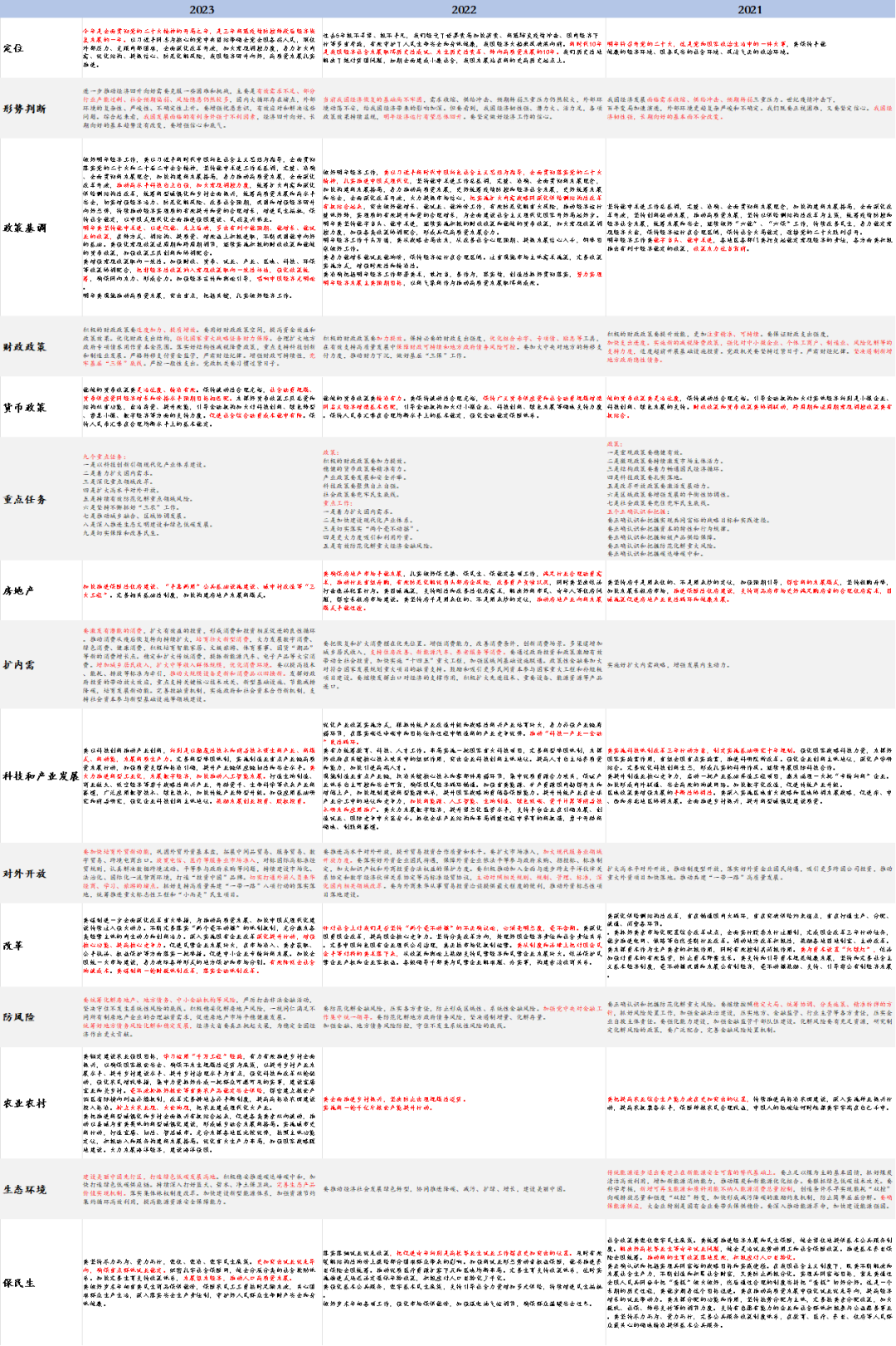 对形势的判断相对审慎,以进促稳,对经济增速诉求增加。本次会议对内部形势的判断,由“三重压力”变成“有效需求不足、部分行业产能过剩、社会预期偏弱、风险隐患仍然较多”,整体相对审慎。“由2022年的“稳字当头、稳中求进”变为“稳中求进、以进促稳、先立后破”,对进的着墨抬升,显示对经济增长的诉求上升。本次重提“先立后破”,可能也是意在规避政策合成谬误,强调“增强宏观政策取向一致性”,或表明高质量发展的同时也要兼顾经济增速,新动能未实现之前要兼顾旧动能,防止一刀切。