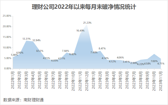 11月理财市场破净率环比下行,南财理财通独家数据显示,理财公司存续公募产品数量为14,912只,截至11月底,合计有703只净值在1以下,综合破净率为4.714%。