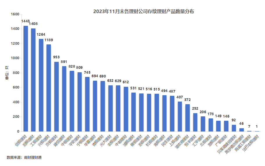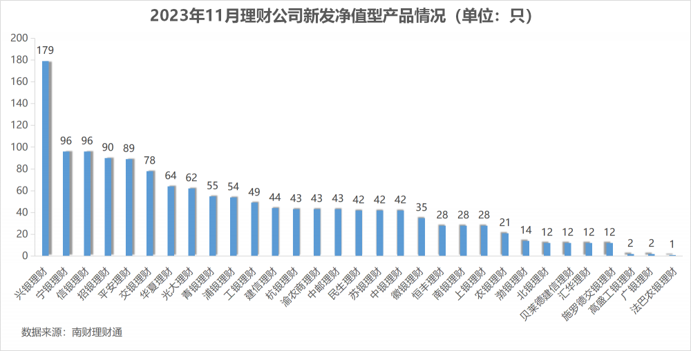 南财理财通数据显示,2023年11月,31家理财公司合计发行了1418只理财产品(同一产品登记编码下不同份额合并计算),环比10月的840只大涨68.81%。发行数量位居前三的理财公司分别为兴银理财、宁银理财和信银理财。其中兴银理财发行数量高达179只,宁银理财和信银理财各发行96只。