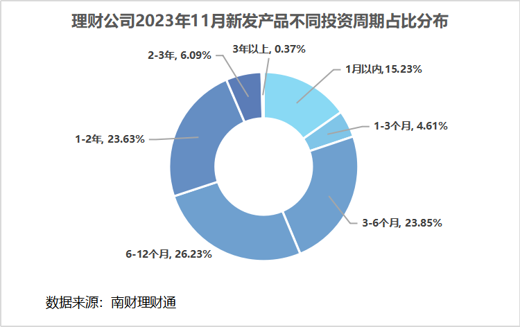 从投资周期看,超短期限产品占比明显提升。其中1月以内新发产品占比15.23%,环比10月份的12.10%提高了3.13%;3-6个月和6-12个月新发产品占比也环比分别提高1.35%和1.29%,11月份新发数量占比达到22.49%和24.94%;3年以上期限产品与上月持平,其余三类期限产品占比均有所下降。