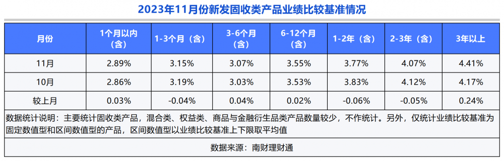 从整体情况看,11月新发固定收益类产品平均定价为3.46%,环比10月份的3.48%微降2bp;新发混合类产品平均定价为4.13%,环比10月份的4.08%上升了5bp。