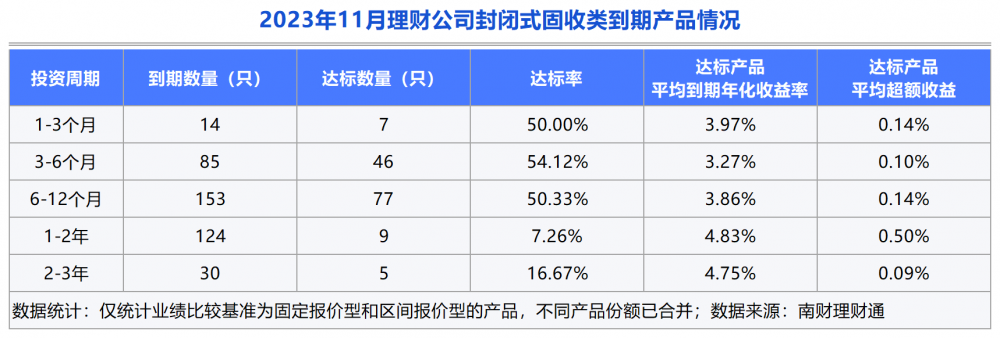 11月到期品业绩达标情况:固收类产品达标率环比持平,短期限产品约半数达标,1-2年期限产品达标率仍处低位