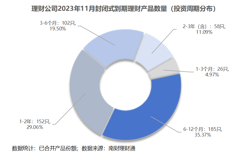 按投资周期看,到期产品的投资周期集中在6个月-2年之间,该投资期限产品占比60%,达到64.44%,投资周期为3-6个月的产品占比19.5%,2-3年到期产品数量有58只,1-3月期限到期产品数量较少,11月无3年以上期限产品到期。