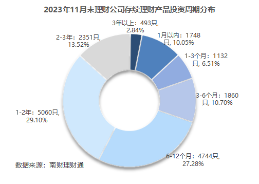 从投资周期来看,11月末存续产品投资周期集中在6-12个月(含)和1-2年(含),占比分别为27.28%和29.1%。投资周期为2-3年(含)的存续产品占比为13.52%,投资周期为3-6个月(含)和1月以内的存续产品占比超10%,分别为10.7%和10.05%,其余投资周期存续产品占比较小。综合来看,投资期限在2年期以下的产品占比超过八成。