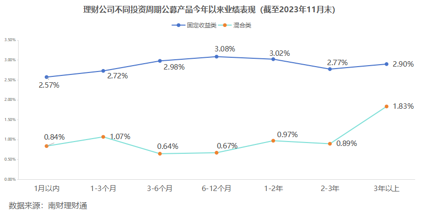 分投资周期看,截至11月30日,固定收益类理财所有投资周期产品今年以来平均净值增长率均较10月末有所上涨,涨幅最大的为投资周期三年以上产品;投资周期2-3年的固收类公募产品平均净值增长率相较之下最低,今年以来平均收益2.77%,较10月末上升0.17%。南财课题组进一步分析固收类公募产品今年以来净值增长的绝对值,我们发现6-12个月期限的产品平均收益率依旧最高,为3.08%,其次为1-2年投资周期的产品(3.02%)。混合类产品中,投资周期为3年以上产品今年以来平均净值增长率最高,为1.83%,在所有期限中较为稳健;投资周期为1-3个月(含)和1-2年(含)的混合类产品今年前11个月收益率平均值分别为1.07%和0.97%。此外,投资周期一月以内的混合产品为11月单月平均收益增幅最大,今年以来平均净值增长率较10月末增长0.37%,主要为红利策略和量化策略产品。由此可见,在固定收益类理财中,投资周期在6个月-12个月(含)的产品有较高的性价比;在混合类产品方面,投资周期在3年以上的产品会有较好性价比。