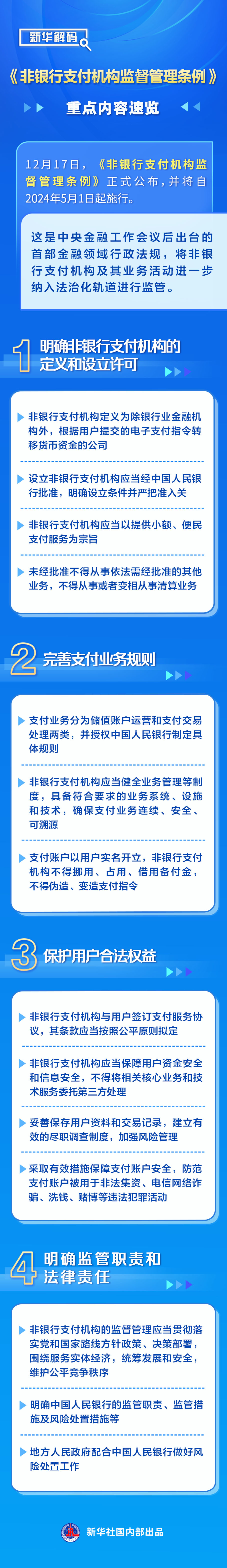 17日,《非银行支付机构监督管理条例》正式公布,并将自2024年5月1日起施行。这部行政法规,将非银行支付机构及其业务活动进一步纳入法治化轨道进行监管,一起来看其中的关键内容——