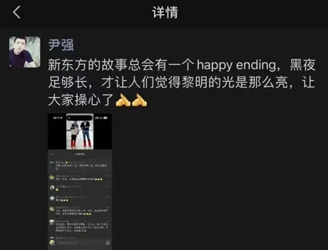 12月16日,东方甄选CFO尹强在朋友圈表示,新东方的故事总会有一个happy ending,黑夜足够长,才让人们觉得黎明的光是那么亮,让大家操心了。