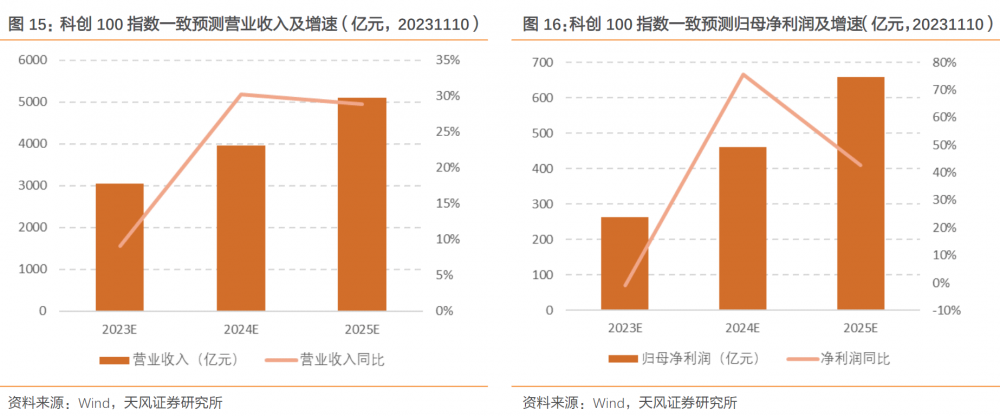 天风证券此前研报中指出,截至2023年11月10日,根据Wind一致预测,科创100指数2023年、2024年和2025年的预期营业收入为3,042.63亿元,3,960.86亿元和5,104.11亿元,同比增速分别为9.07%、30.18%和28.86%;2023年、2024年和2025年预期归母净利润为262.91亿元,461.47亿元和658.99亿元,同比增速分别为-0.96%、75.53%和42.80%。该指数预期盈利能力良好,具备未来发展潜力。