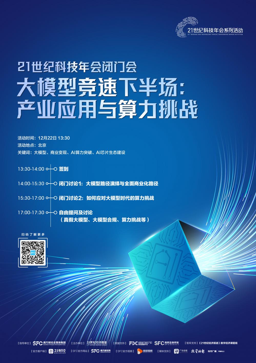 2023年,大模型是当之无愧的最热话题。适值年末之际,由南方财经全媒体集团指导、21世纪经济报道主办的“大模型竞速下半场:产业应用与算力挑战”闭门会将于12月22日在京举办。