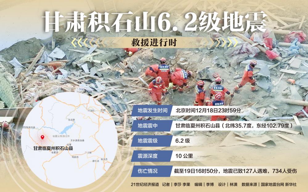 1、截至19日16时50分,甘肃临夏州积石山县地震目前已造成甘肃113人遇难、青海14人遇难。伤员救治、基础设施抢修等工作正持续进行。截至19日19时30分,甘肃及青海震区已全部恢复供电。详情>>