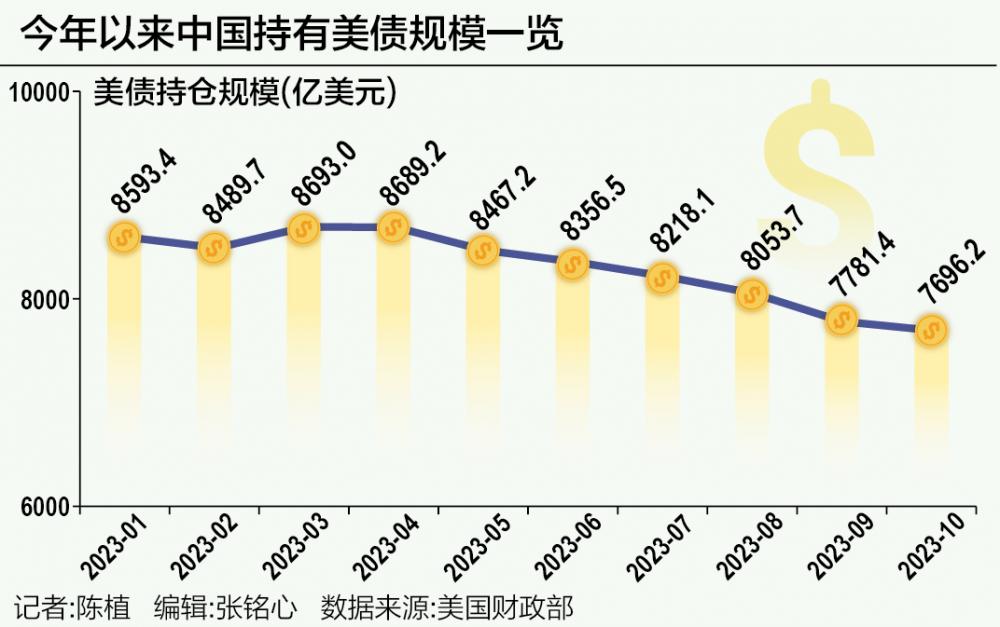 12月19日,美国财政部公布最新的国际资本流动报告(TIC)显示,截至10月底,中国持有的美债规模为7696亿美元,较9月环比减持85亿美元,这意味着中国连续七个月抛售美债,且持仓规模迭创2009年以来的最低值。