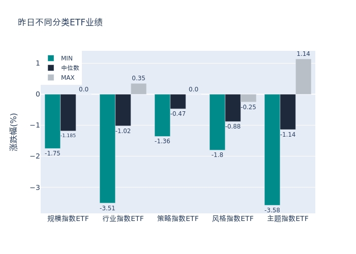 昨日股票型ETF收益率中位数为-1.06%。其中按照不同分类,规模指数中新经济收益率最高,为0.0%;行业指数中汇添富中证能源ETF收益率最高,为0.35%;策略指数中华宝标普中国A股红利机会ETF收益率最高,为0.0%;风格指数中招商中证银行AH价格优选ETF收益率最高,为-0.25%;主题指数中黄金股ETF收益率最高,为1.14%。