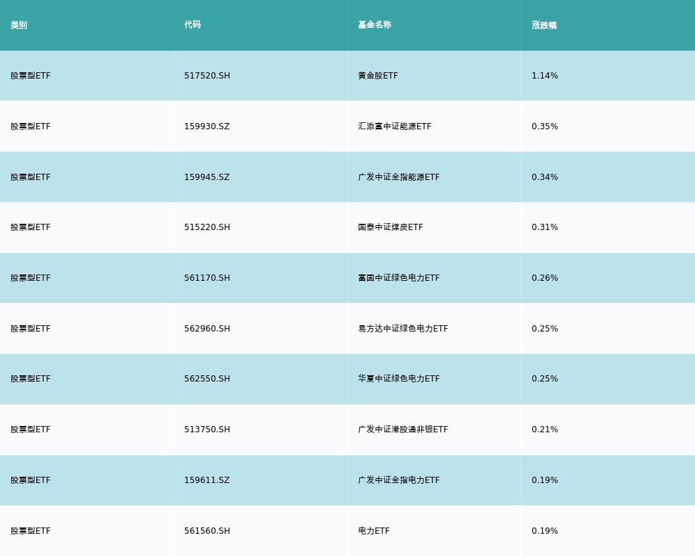 昨日股票型ETF涨幅最高的3支ETF及其收益率分别为:黄金股ETF(1.14%)、汇添富中证能源ETF(0.35%)、广发中证全指能源ETF(0.34%)。涨幅前10详情见下表: